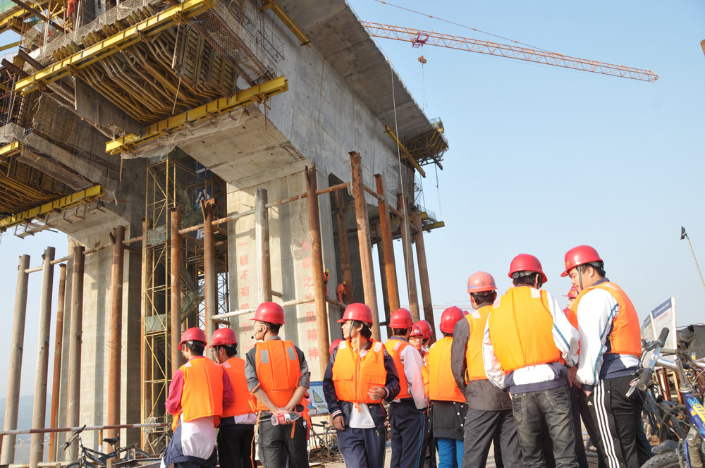 为确保安全,同学们带上安全帽、穿上救生衣,在第二合同段副经理刘新的带领下走上栈桥。项目部吴绍江主任沿线向大家介绍了桥墩的建设情况和移动模架现浇梁施工步骤及施工工艺,当走到主桥桥墩挂篮施工现场的时候,大家都被高大的主桥墩所震撼,纷纷向吴主任提问有关施工技术问题,更有同学抢着要和“大桥主桥墩”拍照留念。
