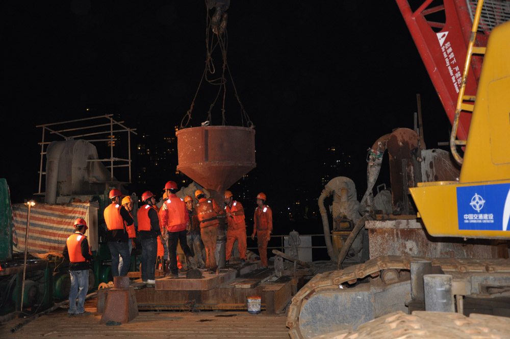 2011年10月29日9点主墩首根大直径(2.8m)深水(88m)桩基灌注成功