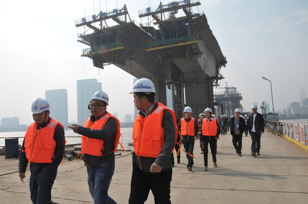 检查组一行上午首先来到第二合同段的施工现场,查看主桥挂篮施工和移动模架现浇梁的施工进度,随后又赴第一合同段预制场和路基施工工地进行查看。下午检查组检查了通道公司合同及档案资料。