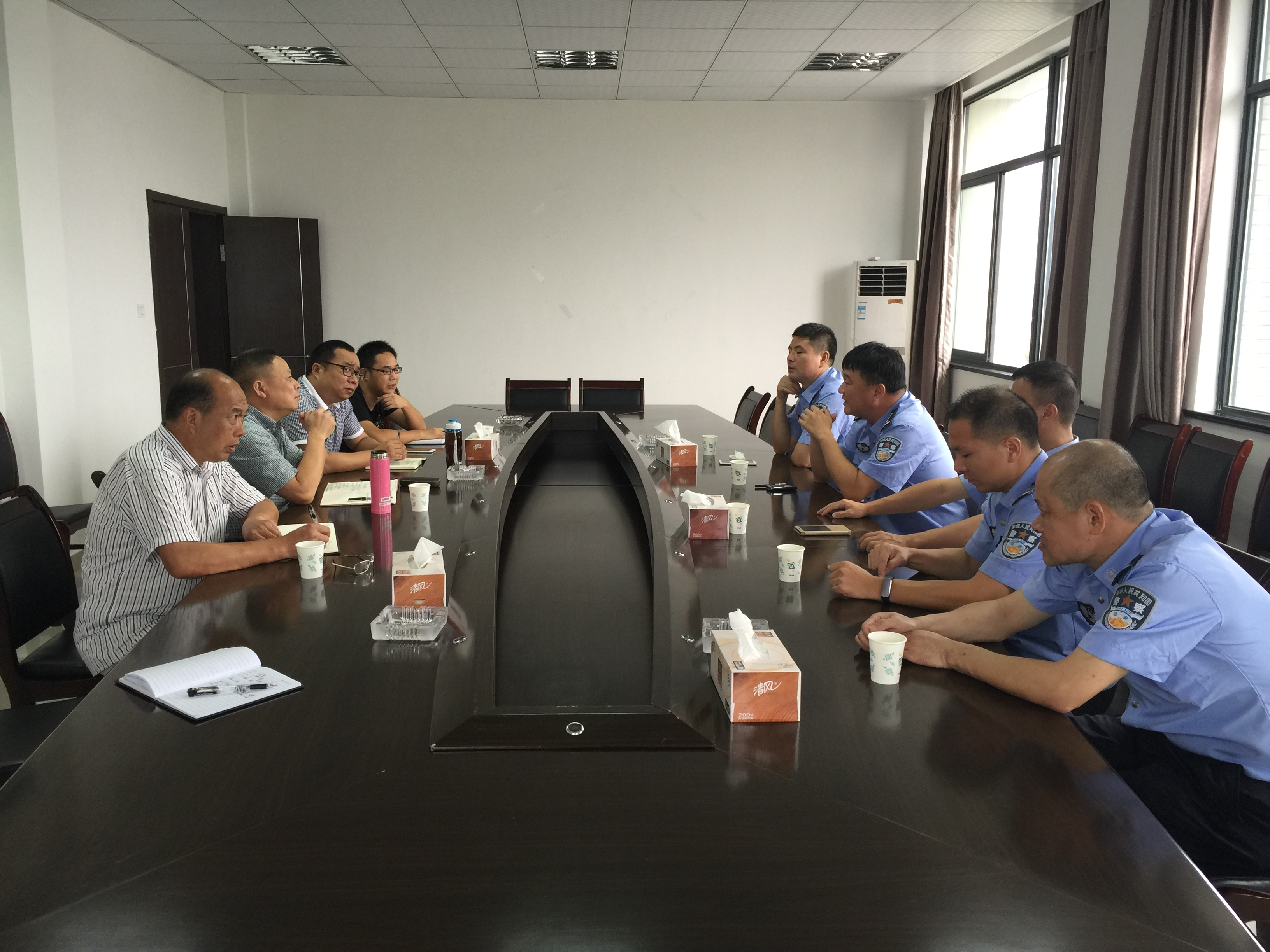 96上午,温州市公安局交警支队党委副书记、副支队长陈贺达一行六人莅临通道公司进行工作指导,通道公司总经理翁雅谷、常务副总经理朱清福和各部门负责人参加座谈会。